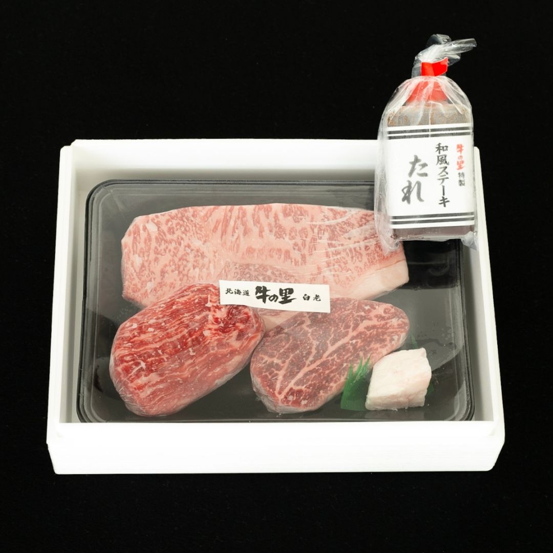白老牛のきらめく霜降りステーキセット(ヒレ、ロース、ヘルシー)※特製ステーキソース付