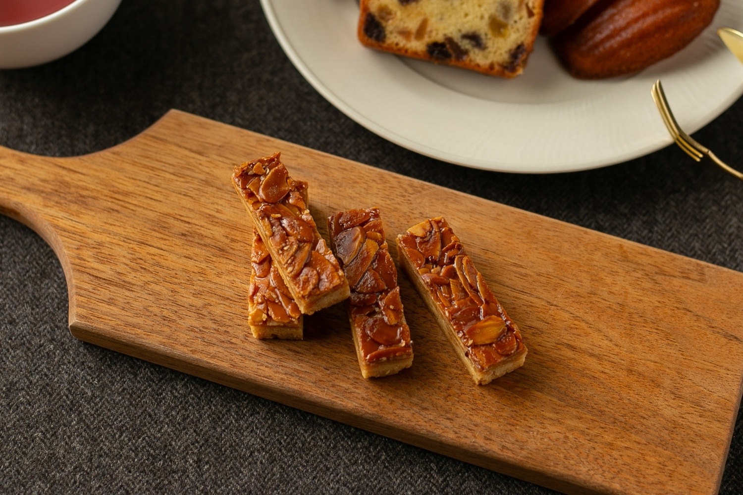 キャラメリゼされたアーモンドスライスがたっぷり乗った、香ばしさと甘さのバランスが絶妙な焼き菓子。