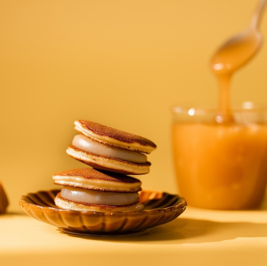 どら焼きの常識を覆す、くちどけの良さ。ふわふわの生地に包まれた生キャラメルが、口の中でとろけて広がります。