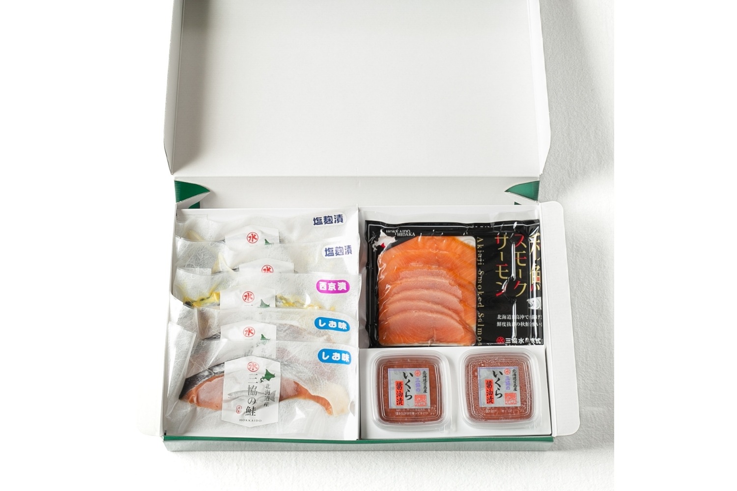 創業70年以上の三協水産が、自社漁獲・自社加工にこだわり、鮮度を活かして丁寧に仕上げました。塩味、西京漬、塩麹漬、スモークサーモン、そして網元のいくら醤油漬けまで、浦河の海の恵みを余すことなく堪能できます。