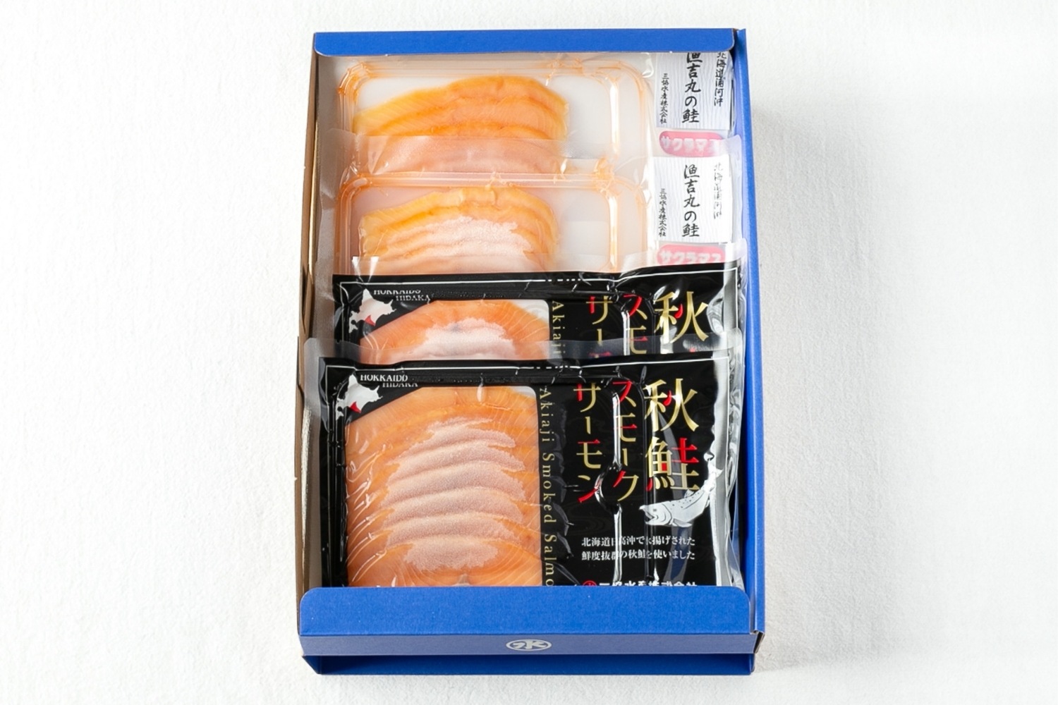 | 内容量 | 280g(秋鮭スモークサーモン 70g × 2、サクラマススモークサーモン 70g × 2) | 製造者 | 三協水産株式会社 北海道浦河郡浦河町浜町32 |