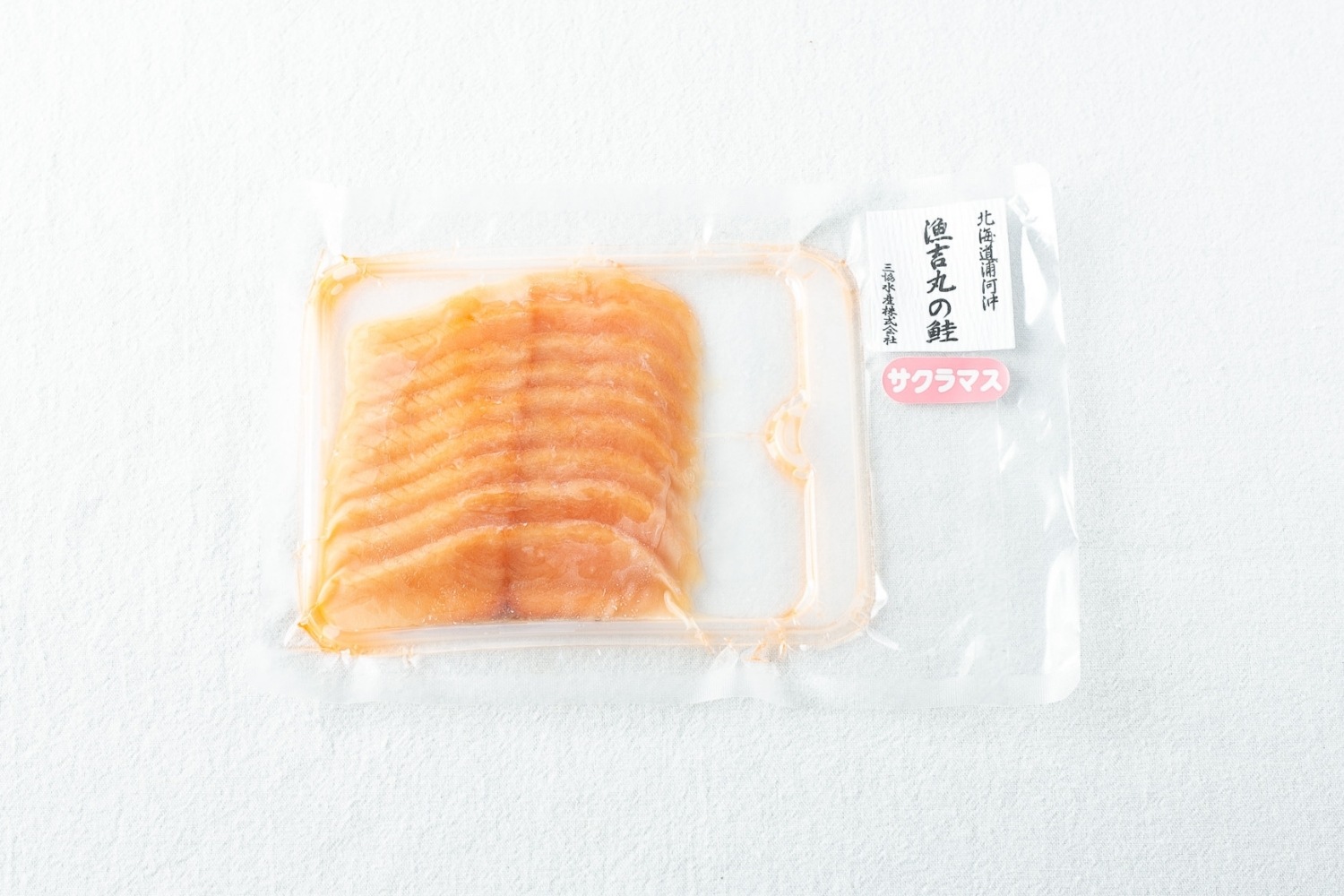 | 原材料名 | 【秋鮭スモークサーモン】秋鮭、食塩、白胡椒、発酵調味料、砂糖、たん白酵素分解物、酵母エキス(一部に小麦・さけを含む) 【サクラマススモークサーモン】サクラマス、食塩、白胡椒、砂糖(一部にさけを含む)