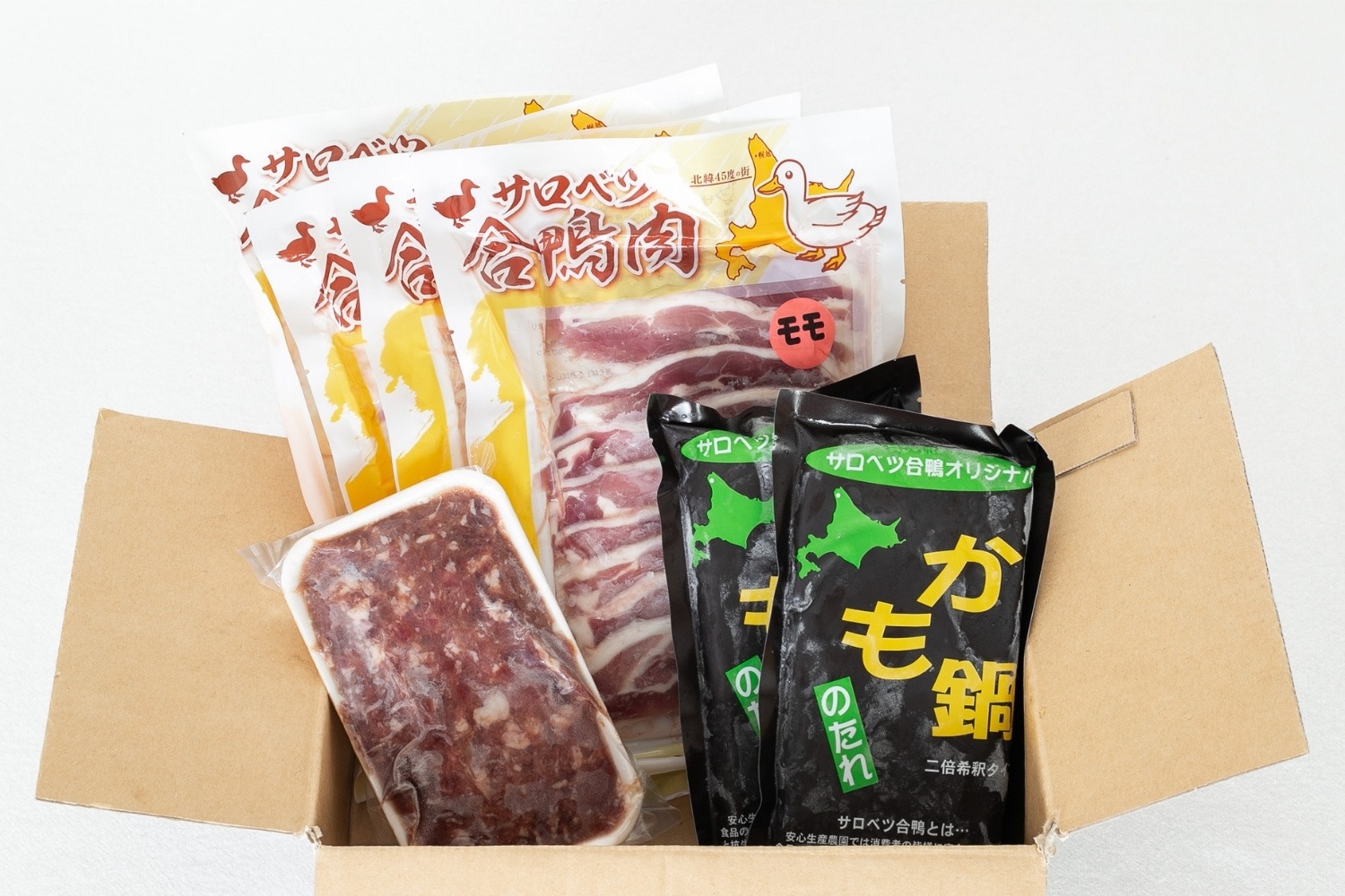 合鴨のモモ肉、つくね、「安心生産農園」オリジナル鍋タレをセットでお届けします。
