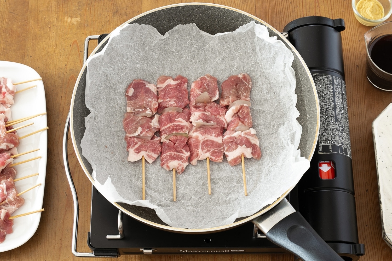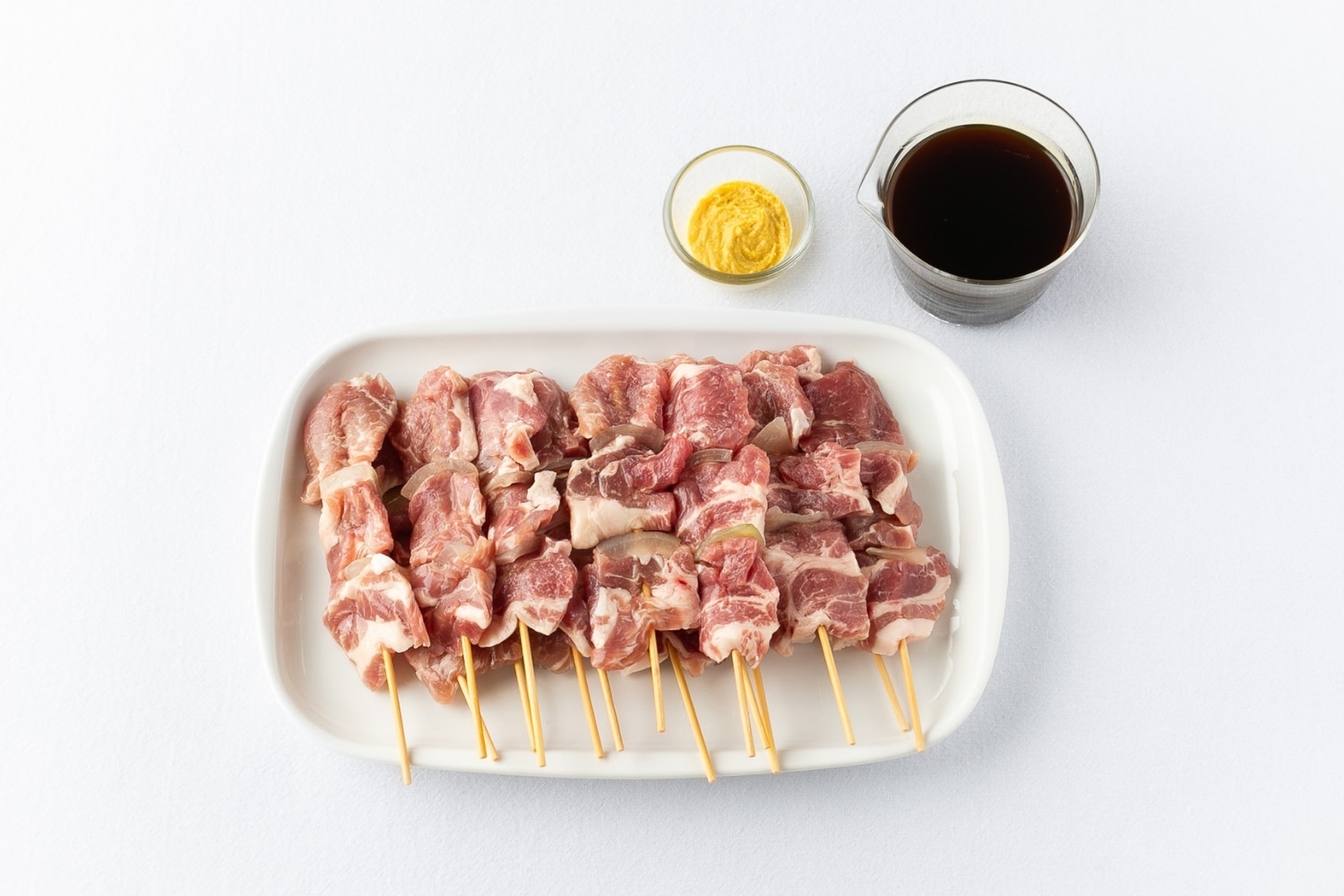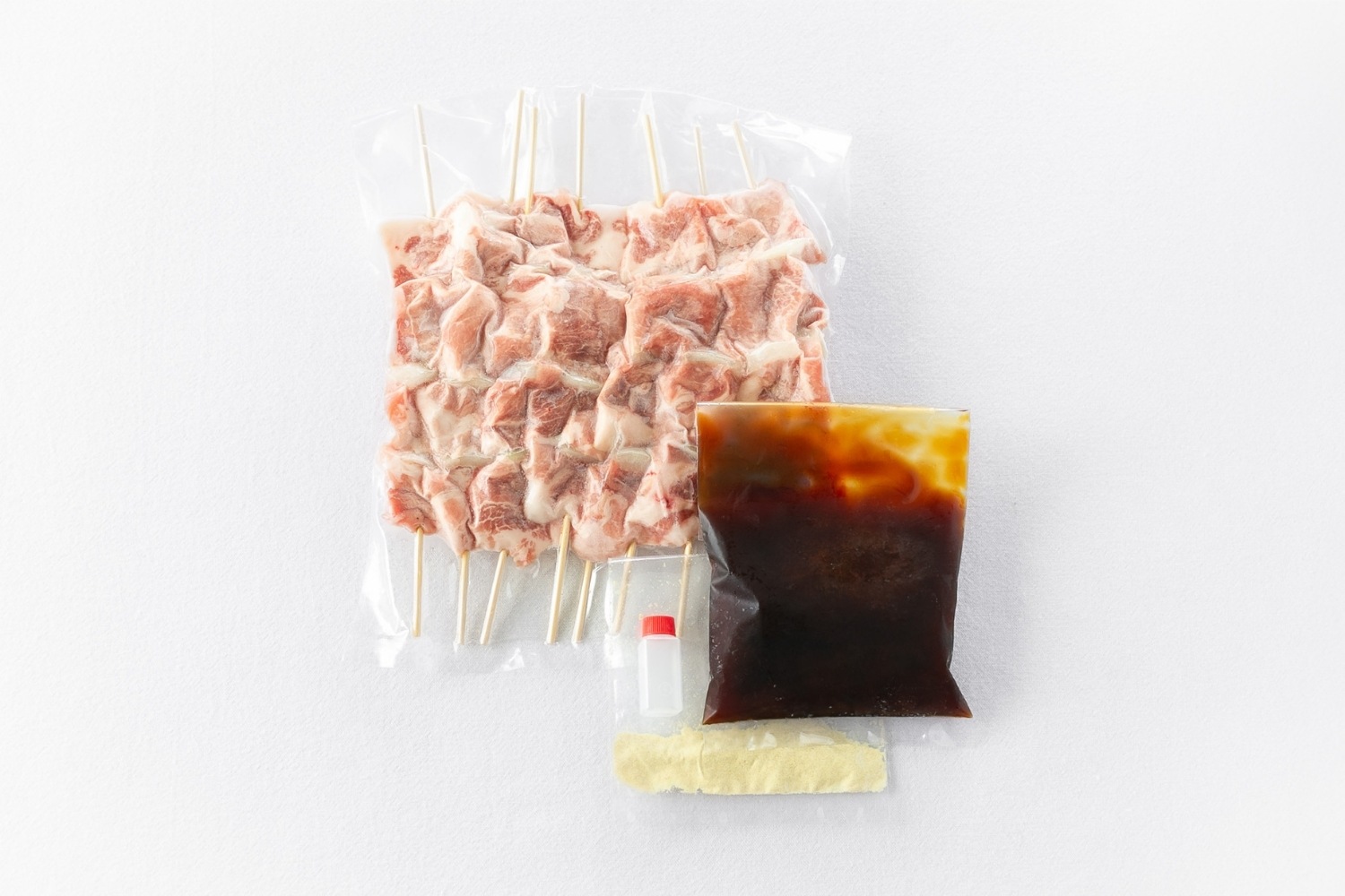 北海道産の豚肩ロース肉と玉ねぎを、一本一本丁寧に手作業で串打ちしています。数多の部位から選び抜かれた豚肩ロース肉は、タレが絡みやすい程よい脂の量なんだそう。ご家庭で手軽に調理できるよう、フライパンで火が通る薄さにカットされています。