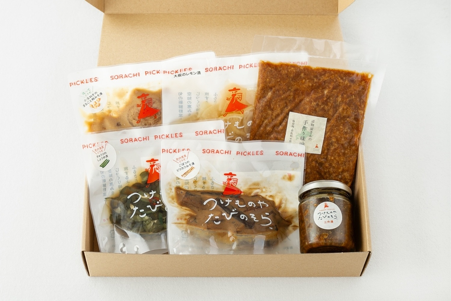 人気の漬物4種類と手づくり味噌、北海道の郷土料理として親しまれる三升漬、の6商品がセットになりました。